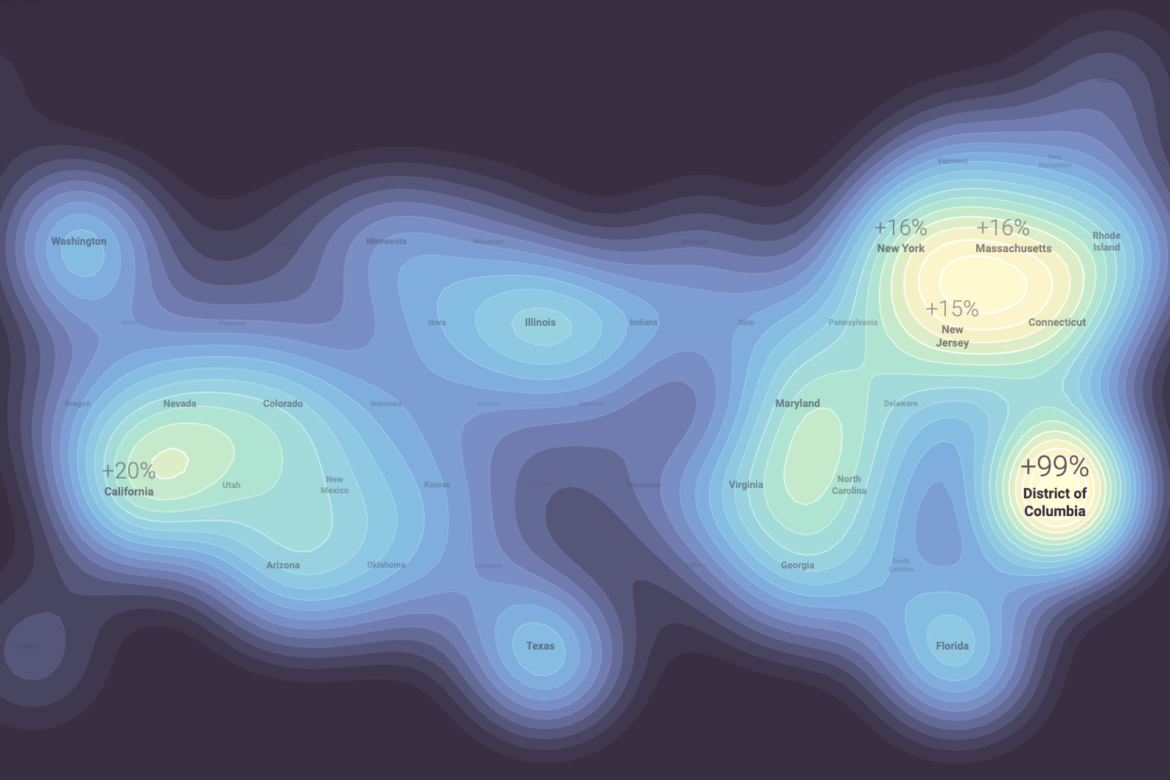 Germany-based data visualization designer Moritz Stefaner has created a visualization depicting how Google searches for political topics like immigration, tax policy, and inflation have changed in U.S. states compared to the last presidential election year, using data from Google Trends. The visualization above, which mimics the map of the United States, shows how search patterns of the term “immigration” in 2024 compared to 2020, with Washington, D.C. seeing an almost twofold increase.