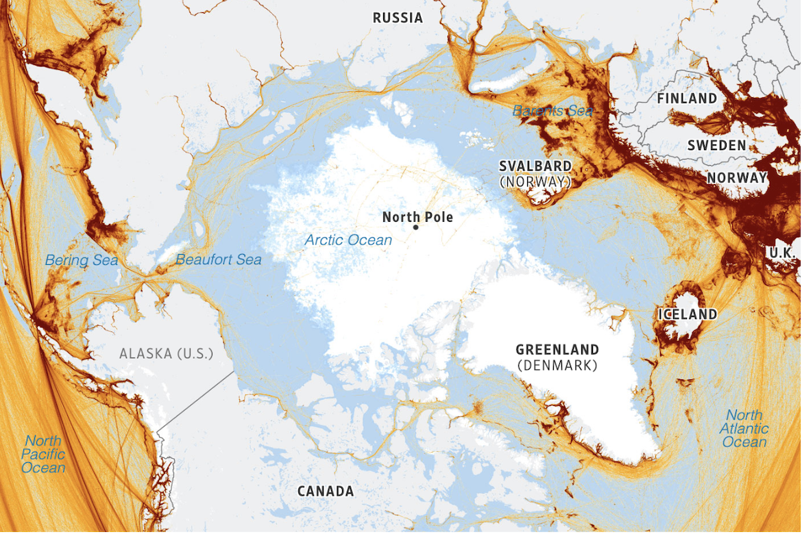 The Wall Street Journal has created a visualization showing the expanding maritime presence of Russia and China near the North Pole. Climate change has led to melting ice, opening new sea routes and making the region more accessible for resource extraction including precious minerals and transportation. The map above highlights maritime activity in 2024, highlighting over 1,300 voyages, with the red areas indicating the heaviest traffic and yellow the least. The Wall Street Journal sourced the data from satellite tracking, maritime traffic databases, and official shipping records.