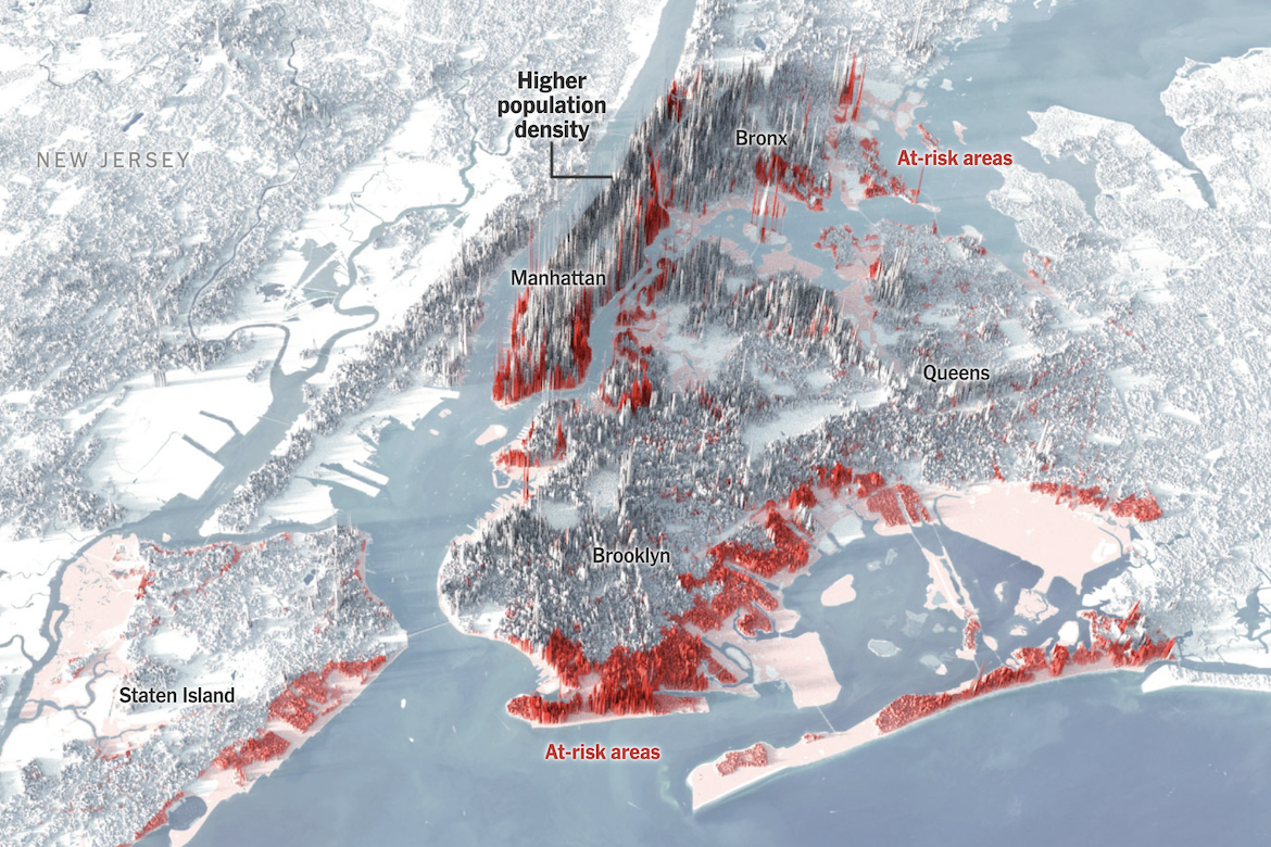 The New York Times has created a 3-D visualization showing New York City’s population density overlaid with areas at risk of flooding by 2080. Vertical bars represent population concentration—taller spikes indicate denser neighborhoods—while at-risk zones are highlighted in red across the urban landscape. The visualization reveals a stark problem: many of the city’s most populous areas, including Lower Manhattan, southern Brooklyn, and coastal Queens, fall directly within projected flood zones. According to the article, approximately 1.4 million New Yorkers currently live in areas that could face significant flooding by 2080. The visualization indicates that if flooding renders some regions uninhabitable, relocating residents within the city would be difficult, as the rest of the city is already densely populated.