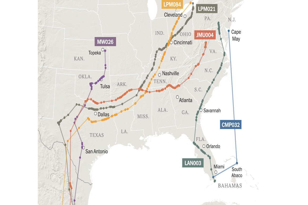 The New York Times has created a visualization charting the migration routes of six tagged monarch butterflies as they travel from release sites across the Eastern United States and southern Canada to their colonies in central Mexico. Each butterfly carries a tag that periodically pings nearby Bluetooth-enabled devices. Every time a device picks up a signal, it sends the tag’s ID, time, and location to a tracking system, creating a chain of detection points as the butterfly moves across the continent. The visualization makes clear that migration is far from uniform, exposing the different routes, detours, and behaviors that one-to-one tracking can reveal.