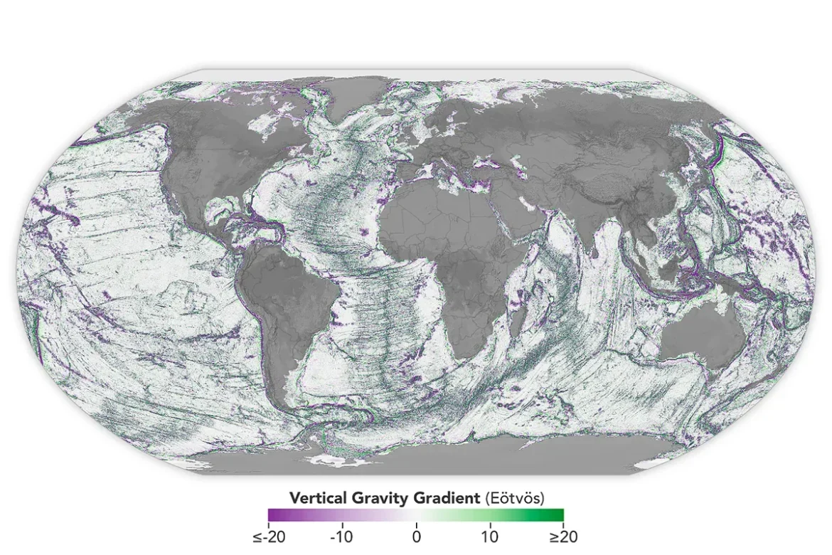 NASA has created a new global map of the seafloor using data from the Surface Water and Ocean Topography satellite, an Earth-observing satellite that uses high-resolution radar to measure changes in sea-surface height. These measurements reveal variations in Earth’s gravity caused by underwater features, allowing scientists to map deep-sea mountains, ridges, and other terrain. The map uses purple to show areas with rapid elevation changes and green for more uniform regions, helping researchers better understand the seafloor.